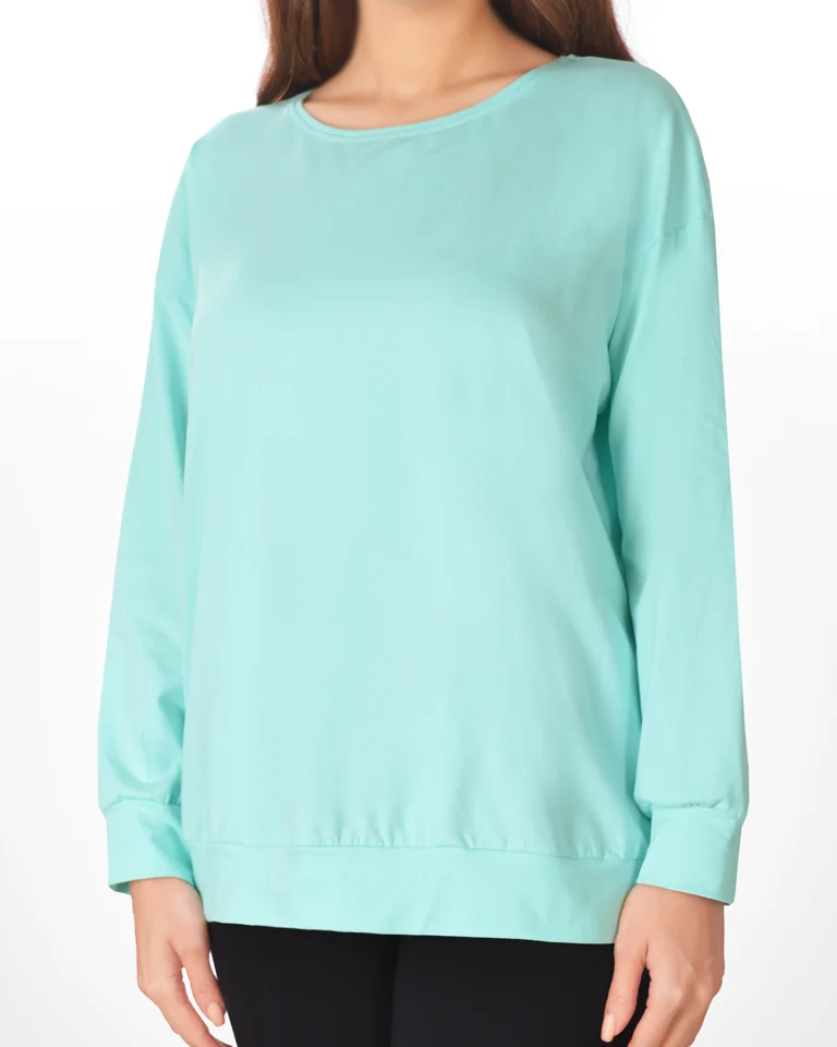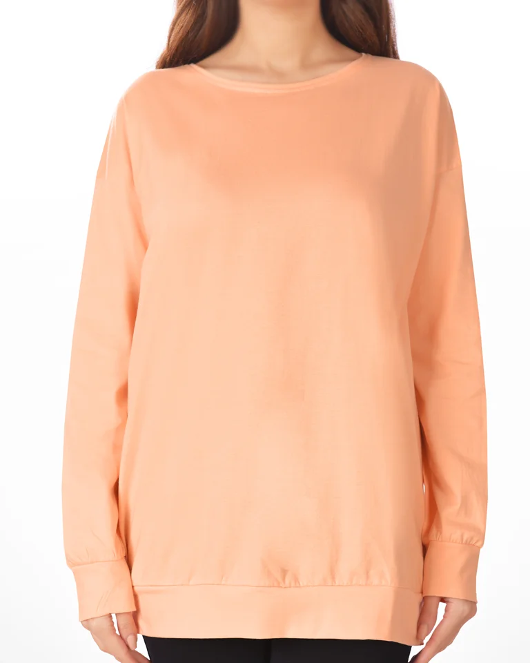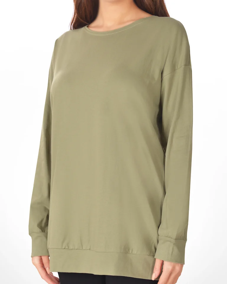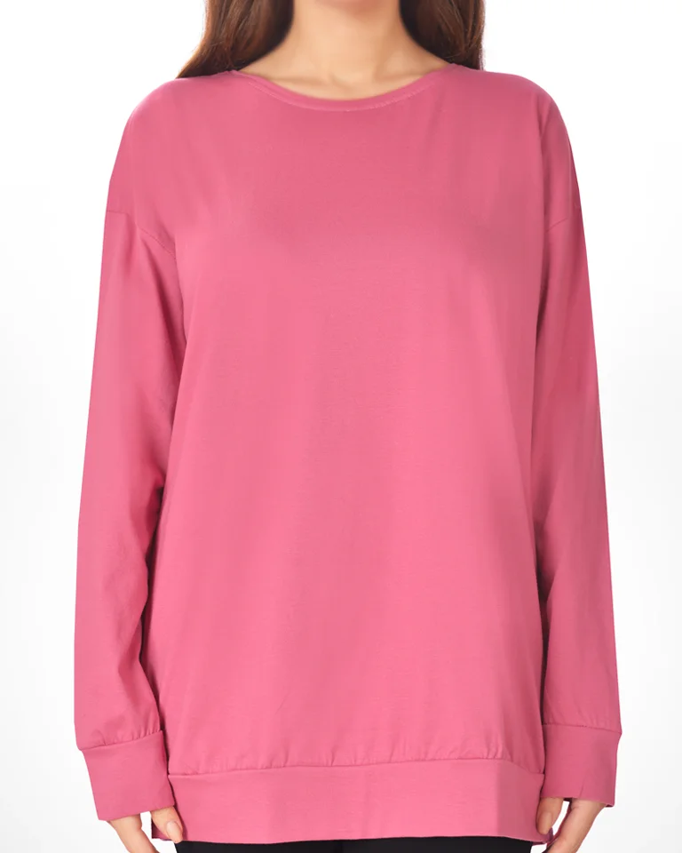 این تیشرت زنانه دارای یقه گرد و آستین های بلند است.