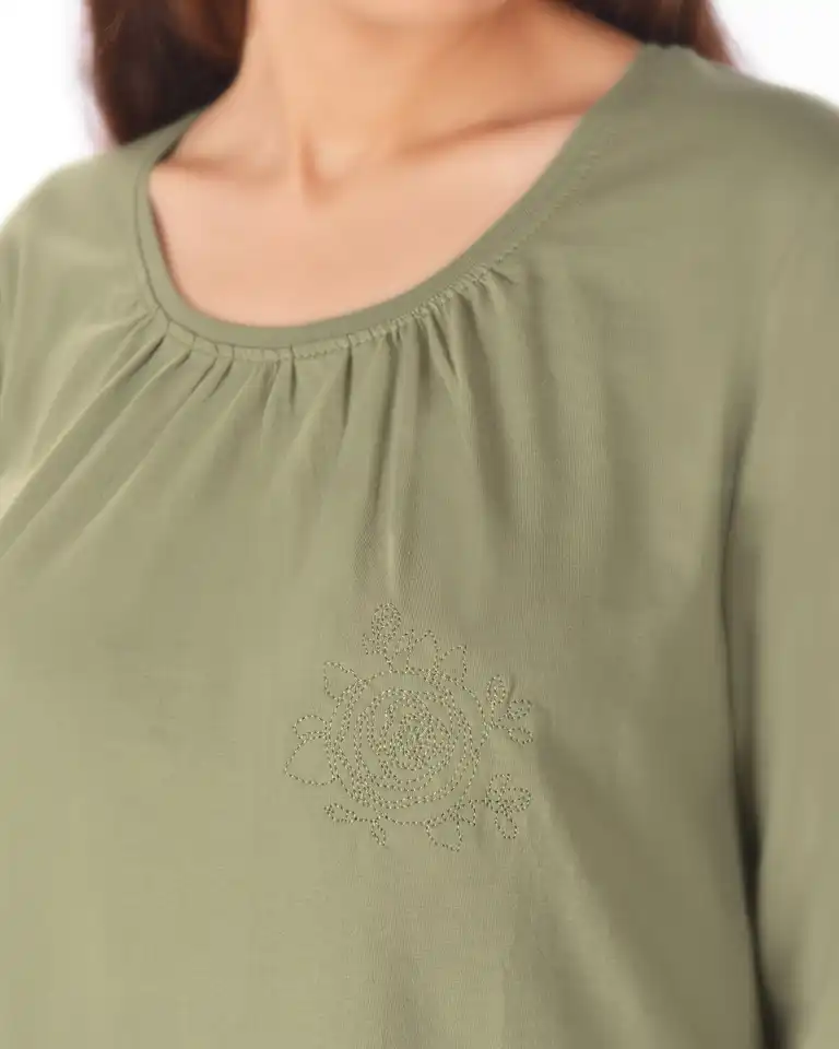 - گلدوزی با کیفیت روی سینه تیشرت، هماهنگ با رنگ زمینه