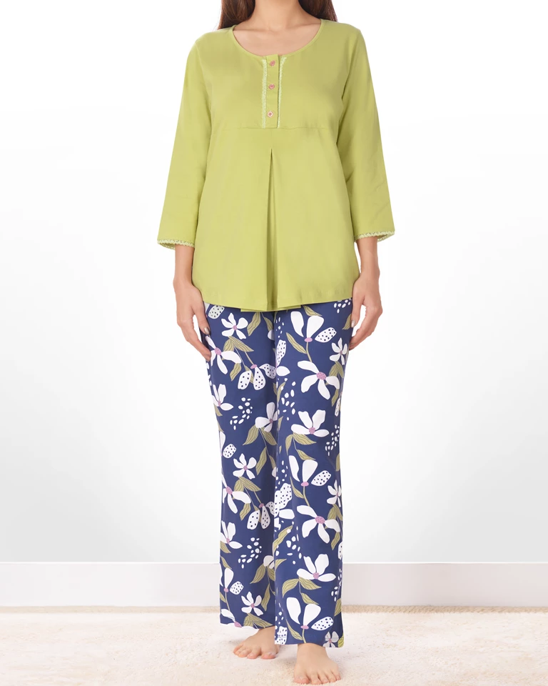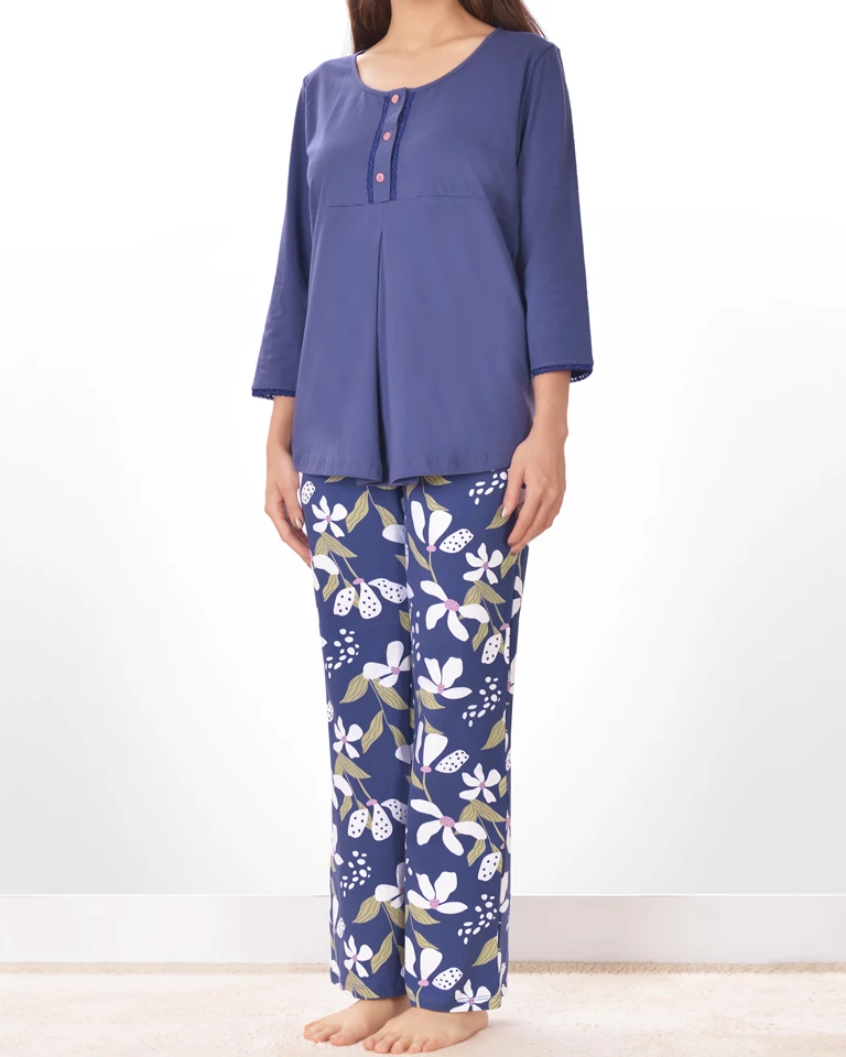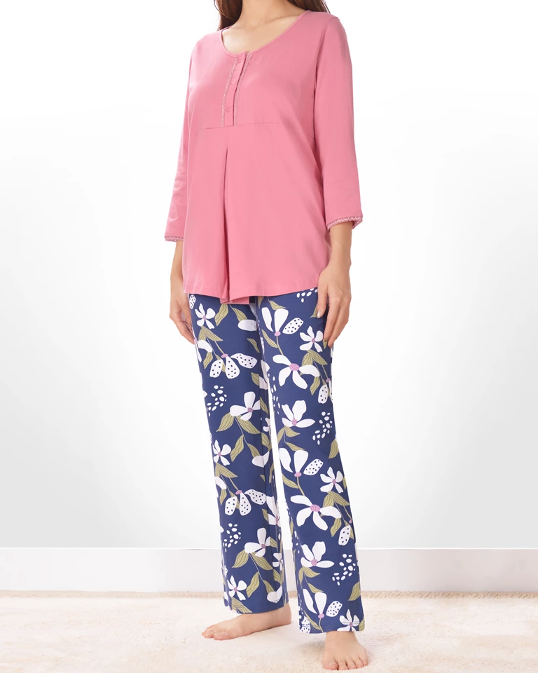یقه تیشرت این ست زنانه گرد و زیر یقه سه دکمه باز شو طراحی شده که مناسب بانوان در دوران شیردهی نیز می باشد.