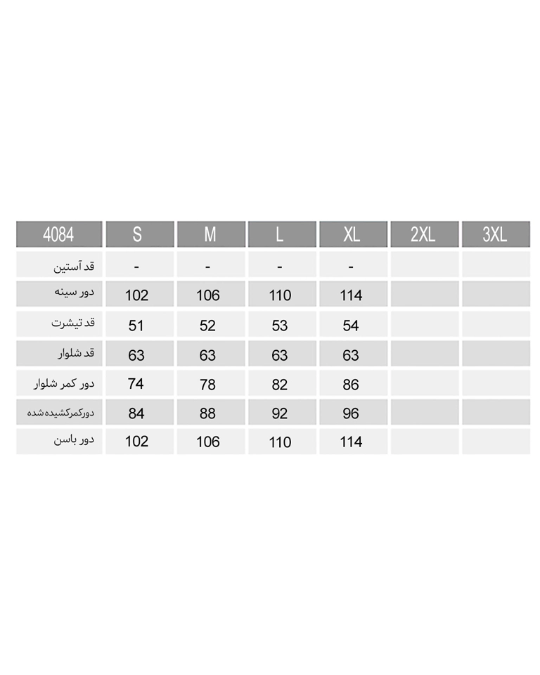 این ست زنانه با پارچه طوسی رنگ و پوشیده از طرح های برجسته عرضه میشود و ۴ سایز متنوع شامل S ،M، L، XL را دارد.