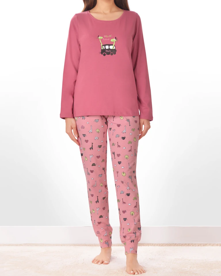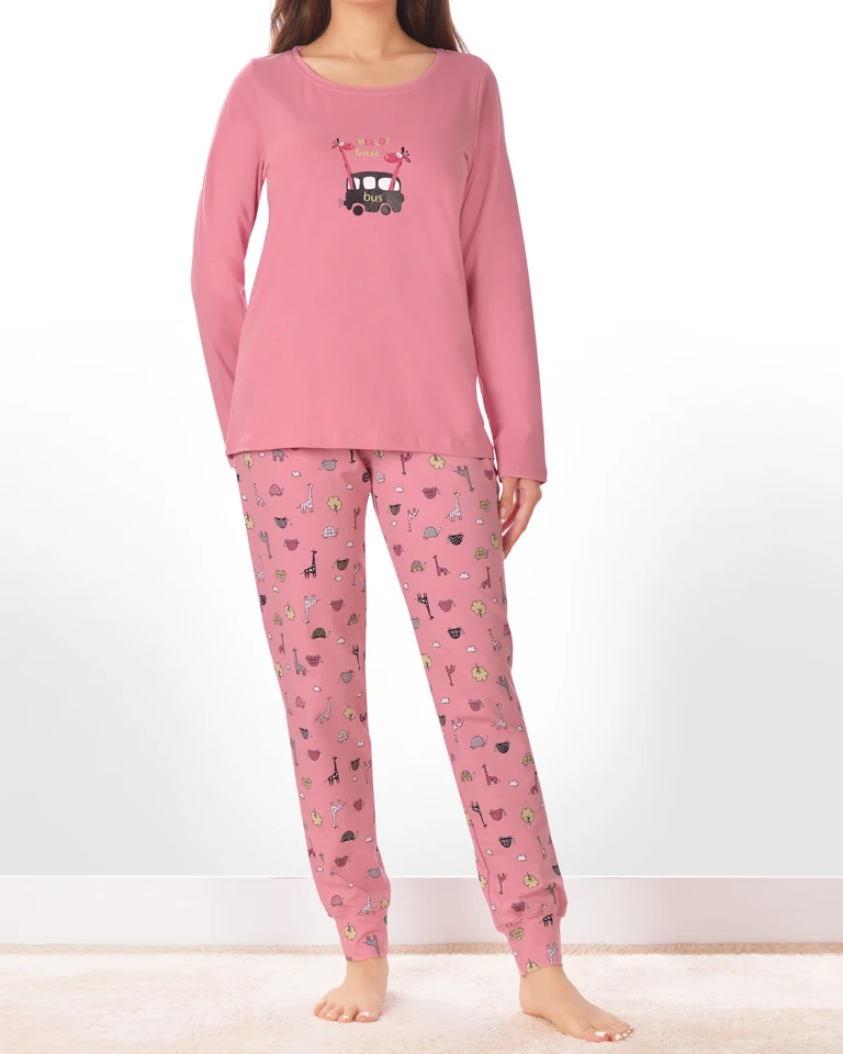 شلوار این ست زنانه صورتی پوشیده از طرح های زیبا طراحی و تولید گردیده است.