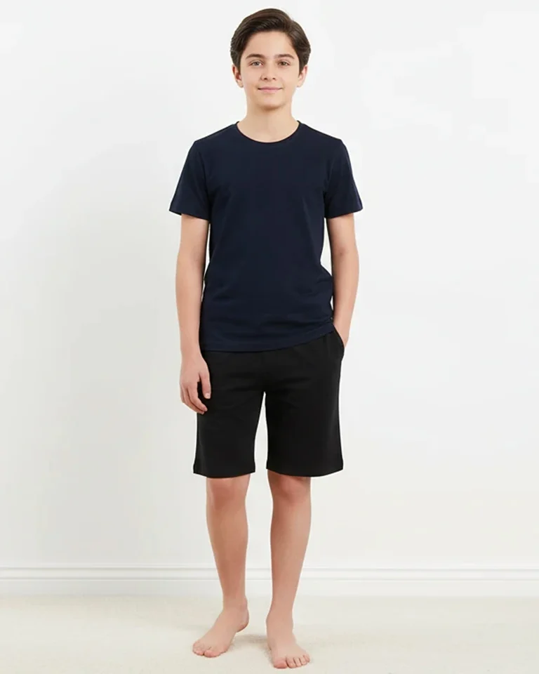 تیشرت این ست نوجوان در دو رنگ شاد و پرطرفدار سرمه ای و سبز و شلوارک آن در یک رنگ مشکی عرضه میشود.